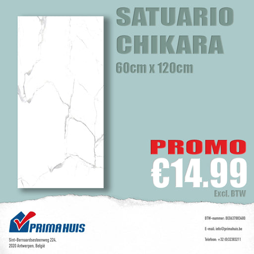 SATUARIO CHIKARA 60×120 cm – Glanzend & Gerectificeerd De SATUARIO CHIKARA brengt de luxe van klassiek marmer in een onderhoudsvriendelijk kera...